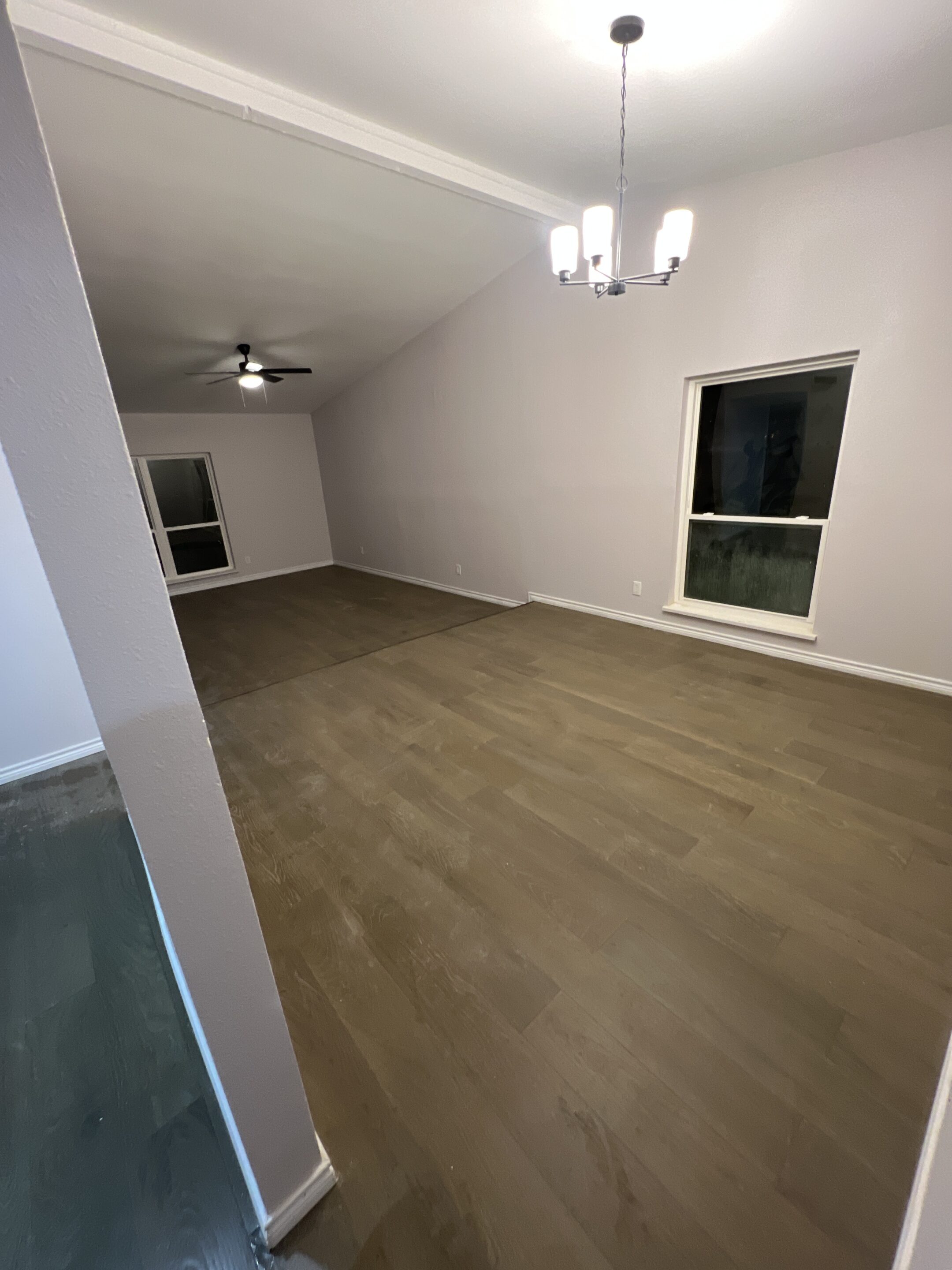 Complete restoration from severe water damage to beautiful dark hardwood floors.