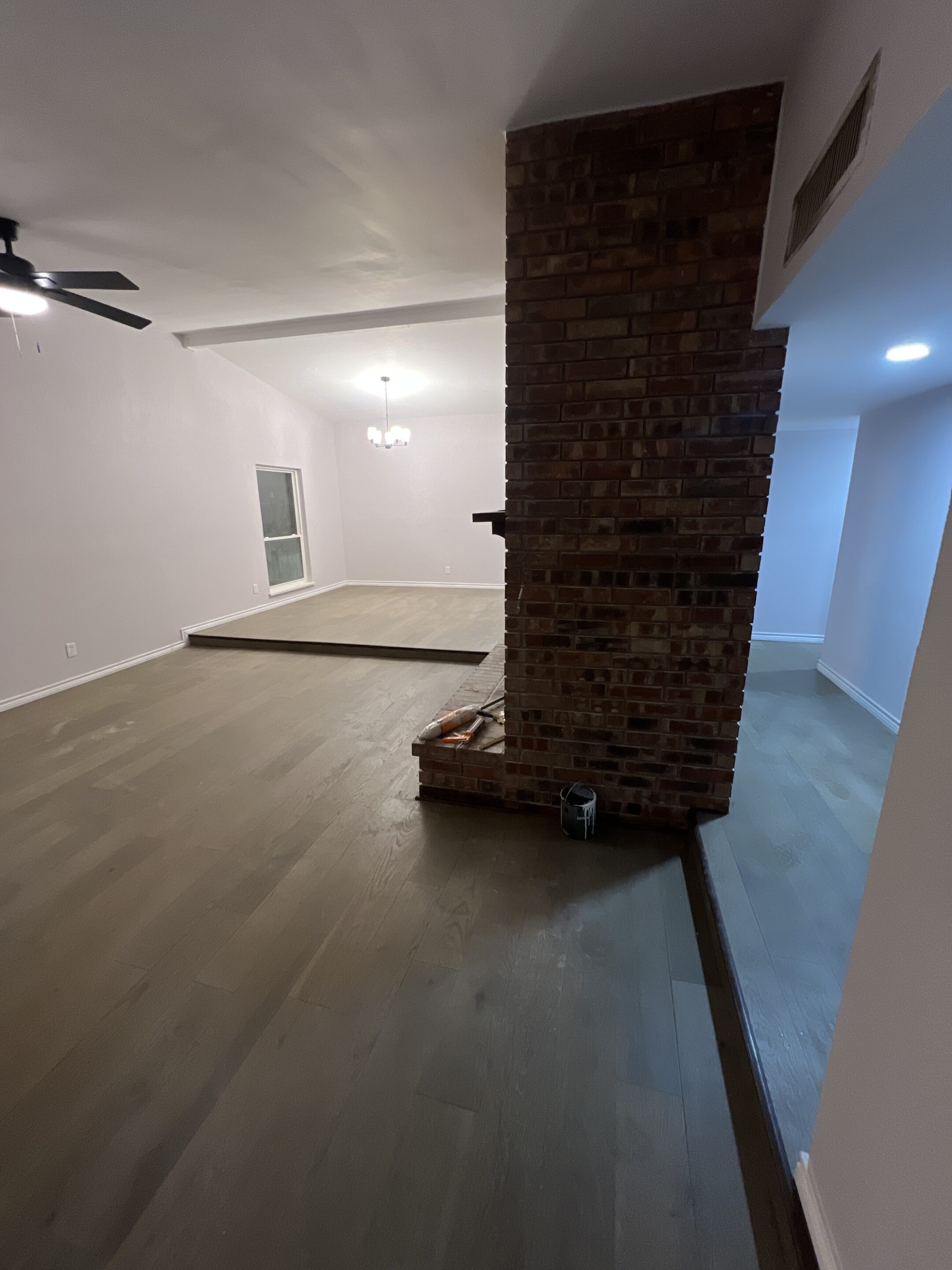 Full living room restoration including new flooring and painting.