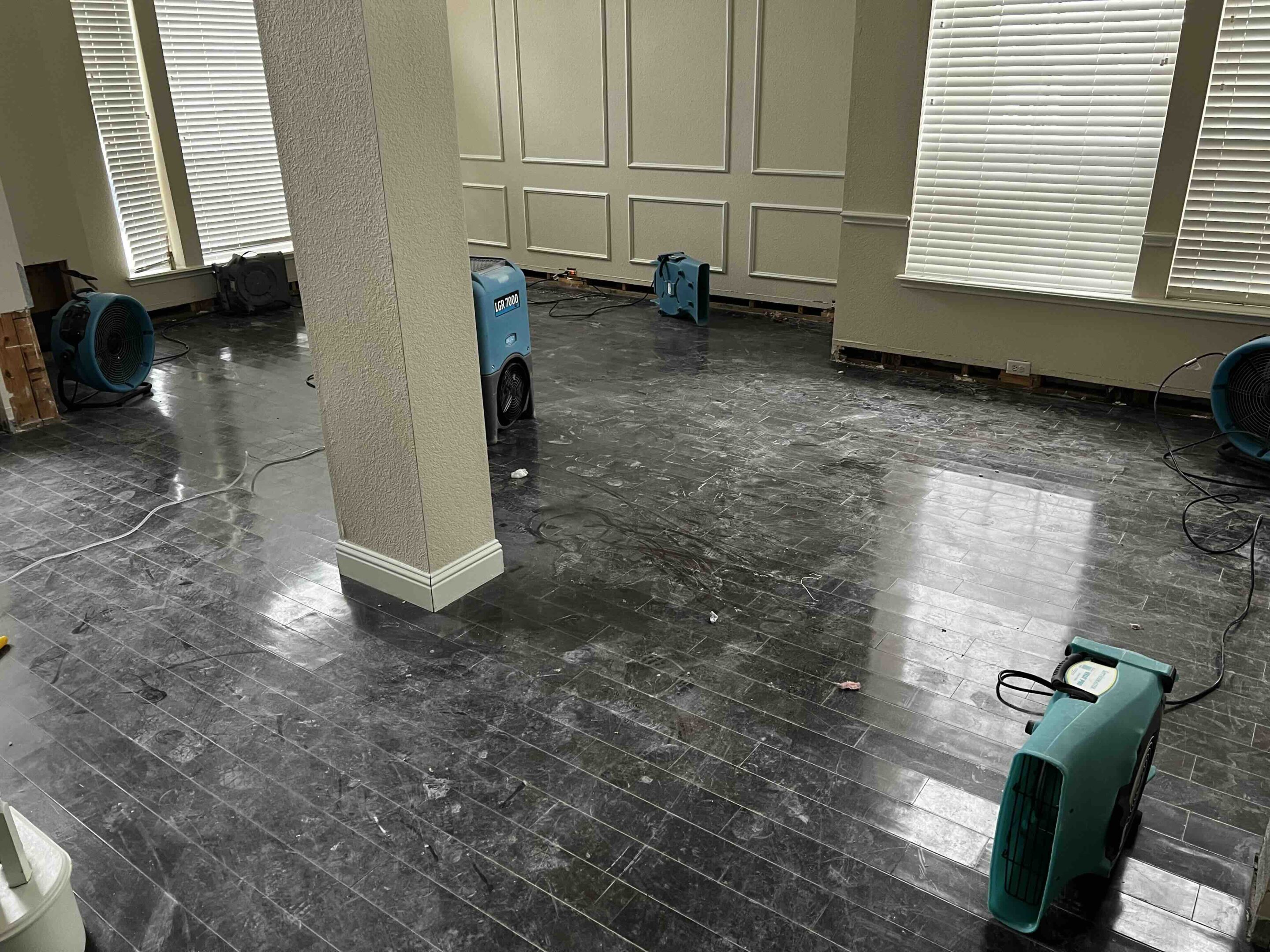 From industrial drying equipment setup to final restoration with new floors.