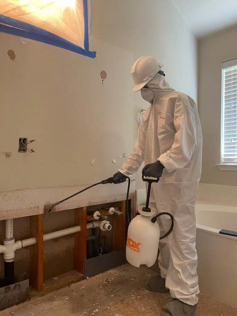 Professional mold remediation with full protective equipment and proper containment procedures.
